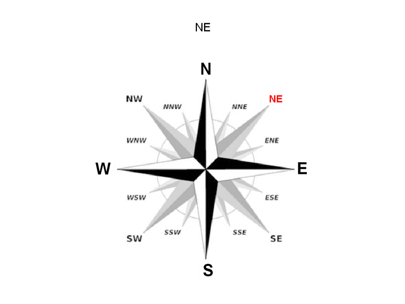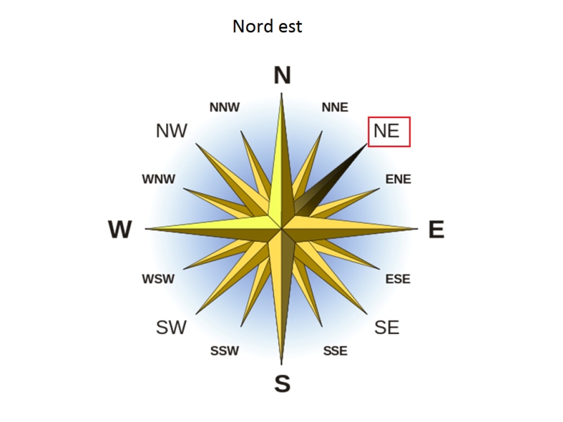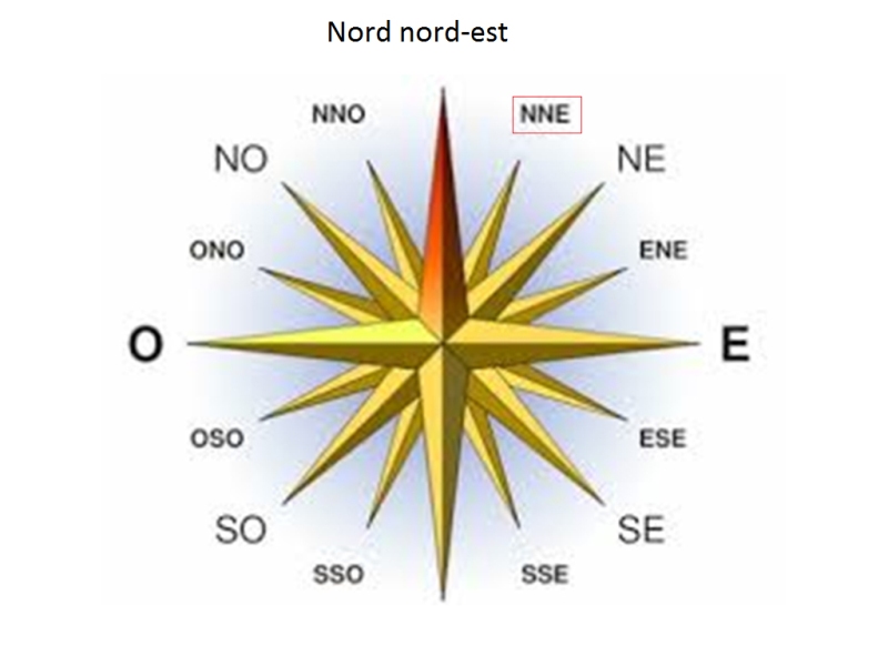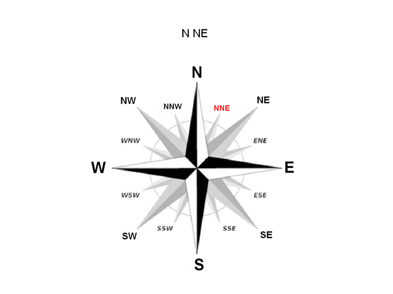 Està situat als 22º,5 del sistema sense interrupció actual de propulsió mecànica, i al "N. 22º,5 E." del sistema que hi havia en l'època de navegació a vela que solament s'apreciaven els rumbs en quartes i fraccions de quarta en nombre de tres.
