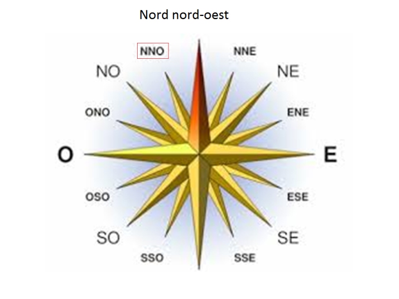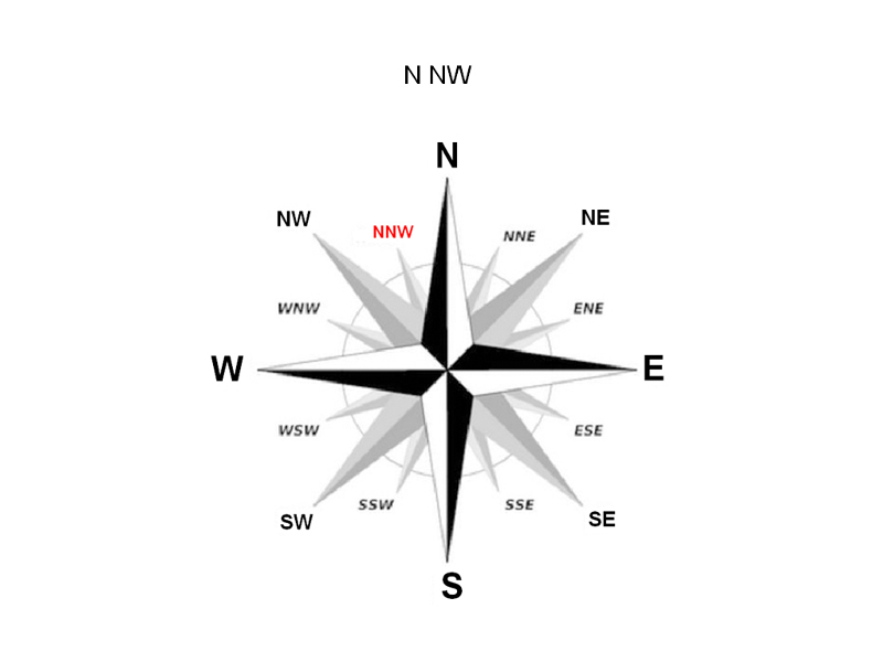 Està situat als 337º,5 del sistema sense interrupció actual de propulsió mecànica, i al "N. 22º,5 W." del sistema que hi havia en l'època de navegació a vela que solament s'apreciaven els rumbs en quartes i fraccions de quarta en nombre de tres.