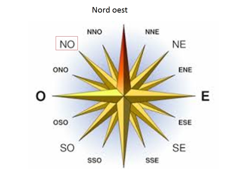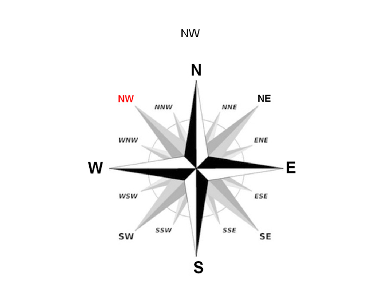 Està situat als 315º,0 del sistema sense interrupció actual de propulsió mecànica, i al "N. 45º,0 W." del sistema que hi havia en l'època de navegació a vela que solament s'apreciaven els rumbs en quartes i fraccions de quarta en nombre de tres.