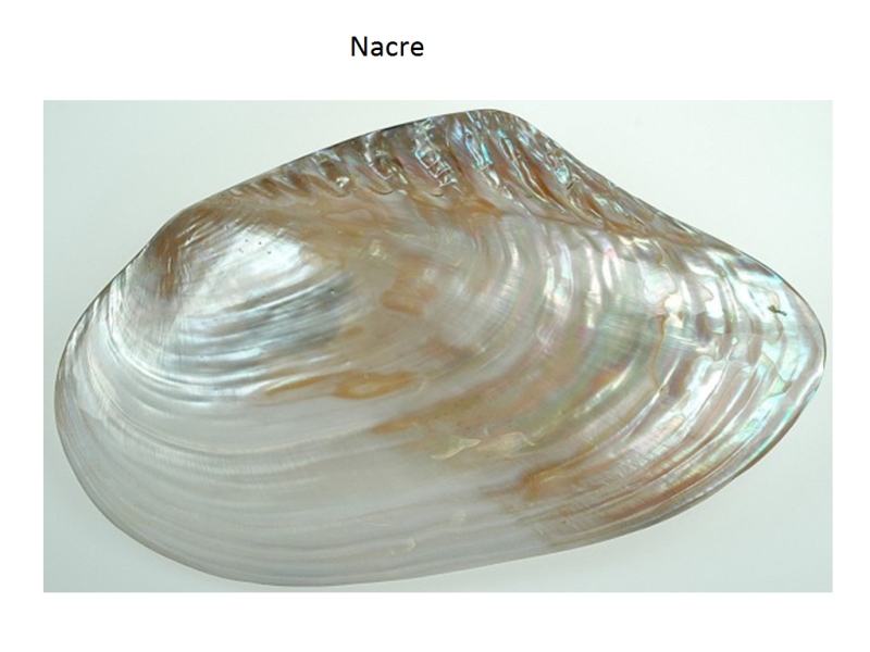 La part interna de les perles està feta de nacre i les conquilles de les ostres també. Els mol·luscs de la família Haliotidae, Trochidae i Turbinidae també tenen nacre.